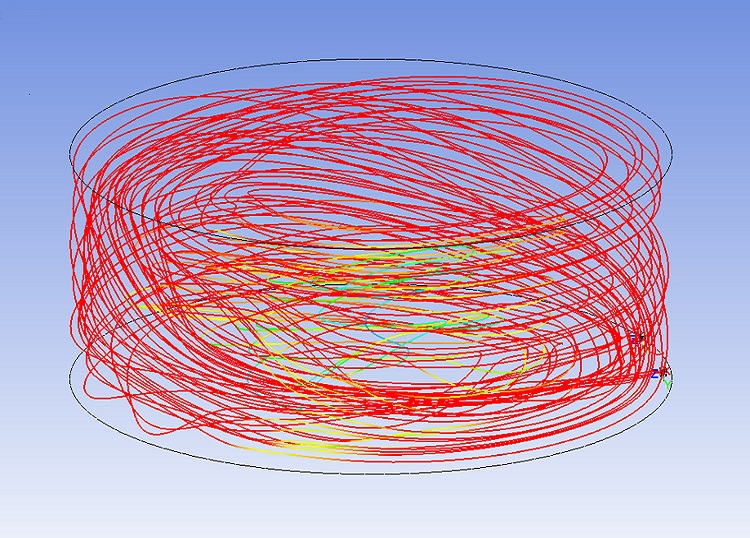 Ansicht des Tanks von oben: Rot sind die Bereiche der Mischaktivität mit der höchsten Geschwindigkeit, blau die mit der niedrigsten.