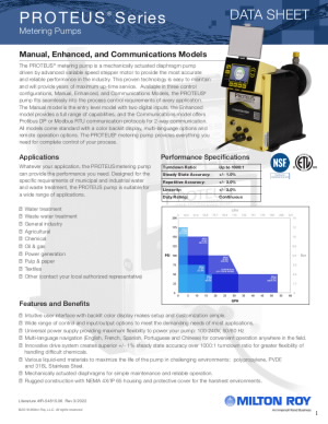 Bơm định lượng PROTEUS là bơm màng được dẫn động cơ khí được điều khiển bằng công nghệ tốc độ biến đổi tiên tiến nhằm giải quyết các yêu cầu cụ thể về bổ sung hóa chất trong xử lý nước.Tất cả ba cấu hình của máy bơm PROTEUS – Thủ công, Nâng cao và Truyền thông – cũng giải quyết các yêu cầu kiểm soát quy trình của nhiều ứng dụng bao gồm xử lý nước và nước thải, nông nghiệp, hóa chất, dầu khí; công nghiệp sản xuất điện, bột giấy và dệt may.