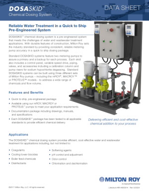 Hệ thống định lượng hóa chất DOSASKID là một hệ thống dựng sẵn, có thể giải quyết những thách thức trong các ứng dụng xử lý nước và nước thải. Với đặc tính cấu trúc bền bỉ, Milton Roy® đặt ra tiêu chuẩn ngành thông qua việc cung cấp độ chính xác nhất quán, đáng tin cậy của bơm định lượng trong một cụm thiết bị định lượng có thể giao nhanh.